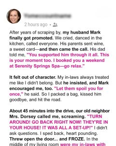 When my father-in-law offered to send me on a luxury spa weekend, I thought maybe my in-laws were finally trying to include me. I was halfway to the resort, driving in peace, when my elderly neighbor called, screaming for me to turn back. What I saw when I got home shook me to my core. For the first three years of my marriage, I was the smudge on my in-laws’ perfect family portrait. I didn’t have the right pedigree or bank account. I wasn’t from their world of country clubs and summer homes. I was just Jennifer, the woman who packed tuna sandwiches for lunch instead of ordering overpriced salads. The woman who, somehow, had managed to marry their precious son.